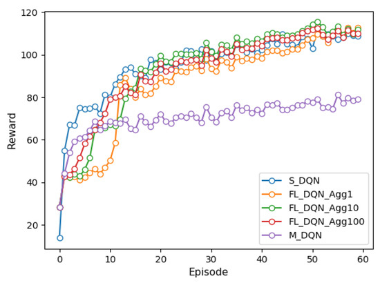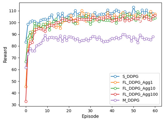 Figure 2 and Figure 3 depict the reward for single-agent, multi-agent, and federated versions of the DQN and DDPG methods under episodes. We trained each model over 6000 episodes and the federated method was experimented with the aggregation period of FL of 1, 10, and 100. Comparing the results of the DQN and DDPG methods, it is evident that DDPG convergence is faster and smoother than that of DQN, further providing more consistent performance on the vehicle. It can also be confirmed that the DDPG method can explore more efficient action spaces in continuous problems because the DQN method deals only with discrete action spaces.