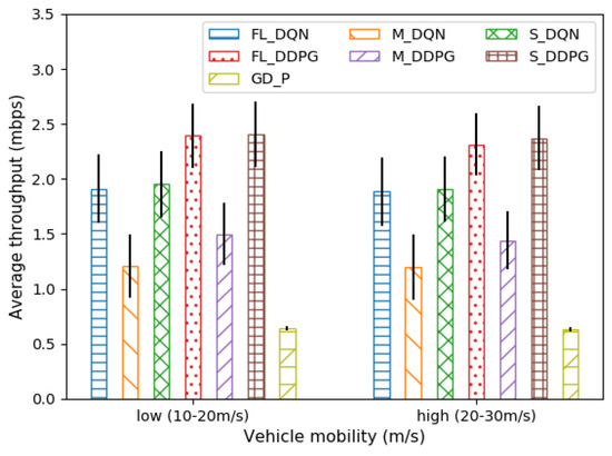 Figure 6 depicts the average throughput when the vehicle is low and high in mobility. The mobility of the vehicle is related to the Doppler frequency (Equation (6)), which is a variable related to small-scale fading. The higher the mobility of the vehicle, the higher the Doppler frequency. As a result, the temporal correlation of the channel may decrease (Equation (4)), and fast fading may cause performance degradation. However, we can observe that the average throughput of all methods gradually decreases to approximately 1–4%. Therefore, we can see that these offloading methods are robust against vehicle mobility.