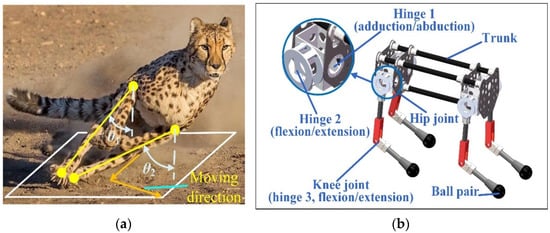 Cheetahs often need to change movement direction frequently during hunting. When the cheetah runs in a plane, the angle of leg adduction/abduction is almost zero. When the cheetah needs to change the motion direction during high-speed movement, the adduction/abduction angle is large. Figure 1a shows θ1 and θ2 are the angles between the leg and the vertical direction in the front view, which are 36.6° and 64.2°, respectively, in the illustrated state. With the cooperation of muscle-driving forces, the cheetah can realize steering movement during running. In particular, for the movement gait, cheetahs use a rotatory gallop with the footfall order of right fore, left fore, left hind, and right hind during curve running [].