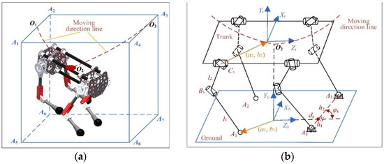 If the position and the posture of the trunk are determined, the leg posture can be reflected through the contact points between the legs and the ground. Taking the foreleg landing as an example, the contact points can be determined by four parameters, h1, h2, dk, and φk, as shown in Figure 2b. h1 and h2 are the distances from the two landing points to the intersection S of A3A4 (A3 and A4 are the two landing points of forelegs) and the Z0 axis, respectively. dk is the distance from the coordinate origin of O0–X0Y0Z0 to S. φk is the angle between A3A4 and the positive direction of the Z0 axis. At this time, the coordinates of the two landing points A3 and A4 can be expressed as
