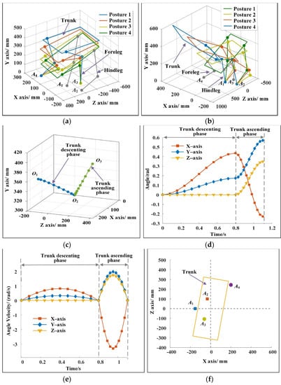 (a) Motion sequence of the robot in the descending phase of the trunk for example 1. (b) Motion sequence of the robot in the ascending phase of the trunk for example 1. (c) Movement trajectory of the trunk for example 1. In the descending and ascending phases of the trunk, the trajectories are cubic functions. (d) Changes of trunk posture for example 1. In the descending phase of the trunk, the angle changes of the trunk around the three axes are 25°, 10°, and 0°. In the ascending phase of the trunk, the angle changes of the trunk around the three axes are 38.01°, −22.69°, and −20.00°. (e) Changes of trunk angular velocity for example 1. The angular velocity of the robot at the moment of leaving the ground is zero. (f) Landing points of the forelegs and the hindlegs for example 1.