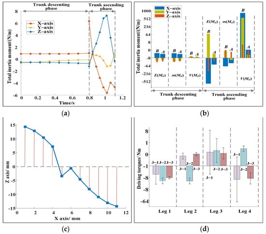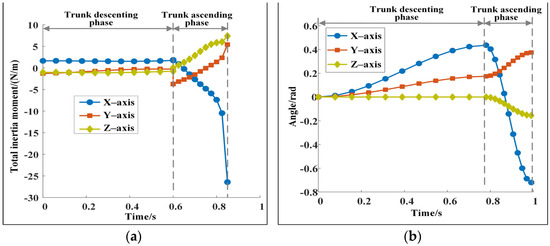 (1) Changes in trunk posture. Figure 3 and Figure 5 show that the posture of the trunk changes during the descending and ascending phases. If the trunk is forced to remain horizontal without a posture change, although the trunk looks more stable, keeping the total inertia moment within a small range at the moment of the robot leaving the ground is difficult. The robot turns over evidently in the flight phase, which leads to motion failure. Figure 7a shows the change of the total inertia moment of the robot when the trunk is forced horizontally. The total inertia moments of the robot at the moment of leaving the ground are −26.43, 5.41, and 7.40 N·m. They are substantially larger than those shown in Figure 4 and Figure 5. Moreover, the change of the trunk angle should be reasonable. For example, Figure 7b shows a set of calculated results for trunk angle changes. Although the total inertia moment of the robot corresponding to Figure 7b is within a reasonable range and the robot is stable, the pitch angle of the robot at the moment of leaving the ground is 41.28°, which is not conducive to the stability of the robot in the next cycle. Figure 3d and Figure 5c show that the pitch angle of the trunk is relatively small at the moment of leaving the ground, and this is conducive to the robot maintaining good dynamic stability.