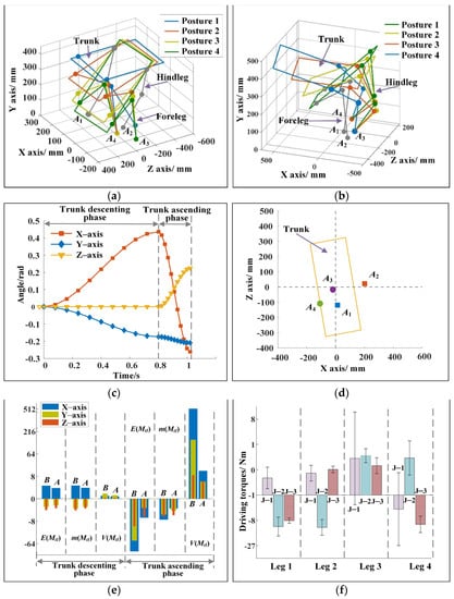 (a) Motion sequence of the robot in the descending phase of the trunk for example 2. (b) Motion sequence of the robot in the ascending phase of the trunk for example 2. (c) Changes of trunk posture for example 2. In the descending phase of the trunk, the angle changes of the trunk around the three axes are 25°, −10°, and 0°. In the ascending phase of the trunk, the angle changes of the trunk around the three axes are −40.01°, −12°, and 12.88°. (d) The landing points of the forelegs and hindlegs for example 2. (e) Changes of the total inertia moment of the robot before and after optimization for example 2. The maximum reductions of the end value, the mean, and the variance of the total inertia moment of the robot after optimization are 98.9%, 90.2%, and 97.6%, respectively, and the decreases are evident. (f) Mean and variance of the driving torques for example 2. The maximum difference of the mean value is 5.88 N·m, and the maximum variance is 6.12 N·m. The driving torques are within reasonable ranges.