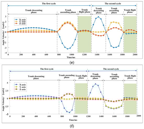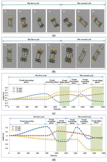 Figure 3a,b show the motion sequence when the robot changes motion direction during running. In the descending phase of the trunk, the two forelegs of the robot are in contact with the ground, and the center of mass of the trunk moves 243.72 mm in 0.8 s. In the ascending phase of the trunk, the two hindlegs of the robot are in contact with the ground, and the center of mass of the trunk moves 492.58 mm in 0.3 s. Figure 3c shows the trajectory of the center of mass of the trunk. When the forelegs of the robot touch the ground, the motion direction vector of the trunk is (0, 0, 1). At the moment when the hindlegs of the robot leave the ground, the motion direction vector of the trunk is (1.74, 0.5, 1.84). From the top view, the included angle of the direction vector is 28.08°, and the running direction of the robot changes clearly. Figure 3d shows the change of trunk posture. The proper change of body posture is conducive to keeping the good dynamic stability of the robot. The angles of the robot around the three axes at the moment of leaving the ground are −13.01°, 32.69°, and 19.81°. The changes of angular velocities obtained by the method described in Section 2.4 are shown in Figure 3e. The angular velocity of the robot at the moment of leaving the ground is zero, and the trunk of the robot will not rotate significantly in the flight phase. Figure 3f shows the positions of the landing points of the legs. In the descending phase of the trunk, the coordinates of the landing point of the two forelegs are (200, 0, and 243.81 mm) and (−62.01, 0, and −107.17 mm). In the ascending phase of the trunk, the landing point coordinates of the two hindlegs are (−151.93, 0, and 0.04 mm) and (−32.88, 0, and 99.98 mm). The leg landing points are no longer symmetrical along the Z0 axis, and the legs have evident adduction/abduction angles. The maximum leg swing angles of the forelegs are 41.04° and 41.09°, and the maximum leg swing angles of the hindlegs are 45.09° and 41.00°. This outcome is consistent with the analysis results of the movement mechanism of the cheetah when it turns during running, as shown in Figure 1a.