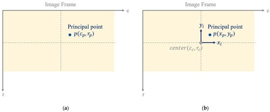 There is another definition of the image frame in the field of PH. Two definitions of image frame are depicted in Figure 2. The origin is set on the image center, which is denoted (), as indicated in Figure 2b. Metric units are adopted in this definition. The coordinates of an image point in this image frame are denoted , and the coordinates of principal point are denoted (). The conversion of principal point in two image frames is listed in Equation (2). The corresponding coordinates in the camera frame are still () that are calculated from Equation (3).
