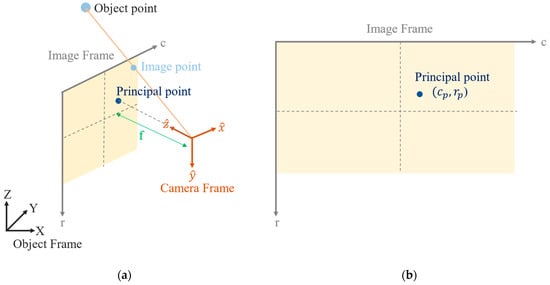 The geometry of perspective projection, as defined in the field of CV, is depicted in Figure 3a. The coordinate systems involved include the object, image and camera frames, but the axes of the camera frame are defined differently from those in the field of PH. Furthermore, pixel units rather than metric units are adopted. This causes the transformation matrix from the image frame to the camera frame to differ from that used in the field of PH. The corresponding coordinates of the image points defined in the image frame are also the row and column. The unit is the pixel. The image coordinates of the principal point are also denoted (), as indicated in Figure 3b.
