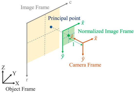 In addition, the image pixel shape is not always modelled as a perfect square in the field of CV. The lengths of the image pixel in the x and y direction are represented by and , respectively. Therefore, the x and y coordinates of the focal length are termed and . CV researchers often prefer using homogeneous coordinate transformation, in which case the images defined in the camera frame are represented with normalized homogeneous coordinates. In this paper, this is termed the normalized image frame, as indicated in Figure 4.
