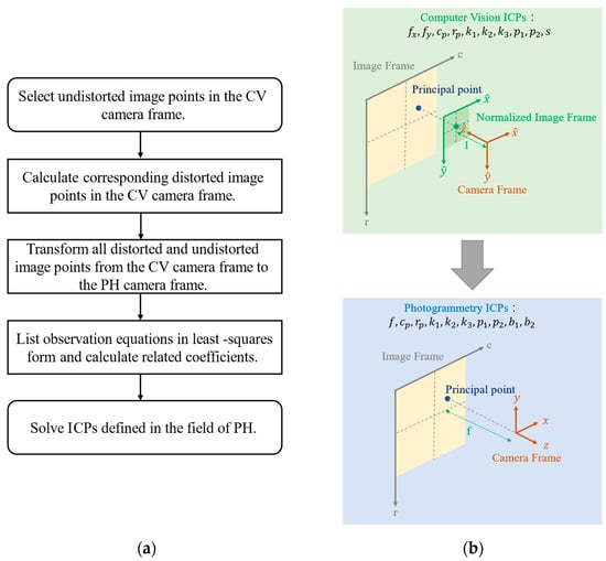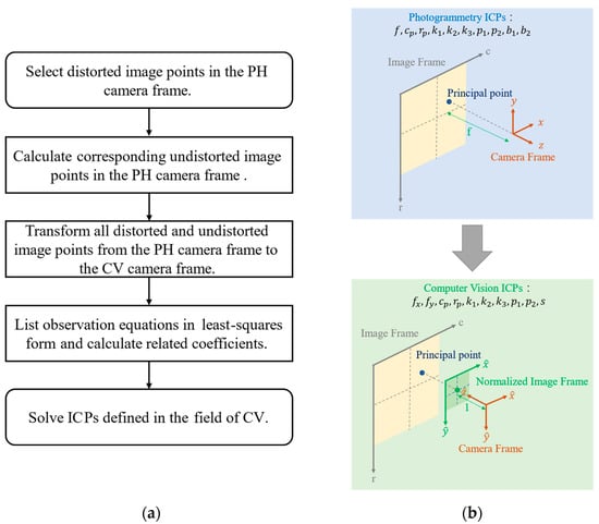 The five-step workflow for transforming PH ICPs to CV ICPs is depicted in Figure 5. Each step is described in Figure 5a, and the entire framework is visualized in Figure 5b. The first step involves the selection of an adequate number of distorted image points as observation points. According to the image points selected, corresponding undistorted image points can be calculated based on ICPs by using Equation (4) to Equation (6). The coordinate system of distorted image points and undistorted image points are defined in the PH camera frame. Thus, the second step involves the calculation of the corresponding undistorted image points. The procedure was described as in the section ‘Geometry of Perspective Projection Used in the Field of PH’. The proposed ICP transformation method requires at least three observed image points to generate a solution. However, the solution generated when the minimum number of points is used may not be reliable. A reliable solution requires not only an adequate number of observation points, but also an even distribution of observation points. Selecting observation points at a particular intervals across the whole image may be a suitable strategy for achieving an even distribution. This can ensure that the most reliable solution can be obtained even when the number of observation points is limited.