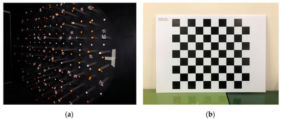 The camera calibration methods used in the fields of PH and CV differ. The technique in the field of PH is more rigorous, and includes a greater number of camera parameters [26]; whereas, the technique in the field of CV emphasises automation, efficiency and versatility [27]. Remondino and Fraser [23] performed a detailed review of the calibration approaches used in the fields of PH and CV. In this paper, only one method was selected for each camera mathematical model, to reduce complexity. A rotatable table with coded targets [28] and Australis photogrammetric software (version 8.0, Photometrix, Melbourne, Australia) [29] were used for PH camera calibration. A checkerboard [24] and the Camera Calibrator app in MATLAB (version R2021b, The MathWorks, Inc., Natick, MA, USA) [30] were used for CV camera calibration. Figure 7 displays the representative camera calibration methods from the fields of PH and CV used in this paper.