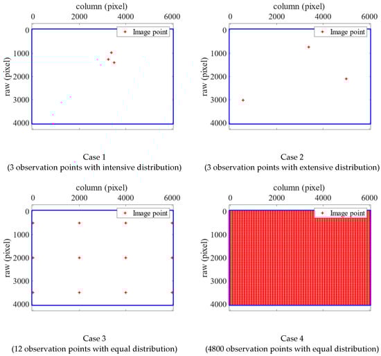 The proposed algorithm uses several image point selection strategies to account for the effects of the number and distribution of selected observation points. The first strategy involves three selected observation points with an intensive distribution (Case 1). The second involves three selected observation points with an extensive distribution (Case 2). The third involves 12 selected observation points evenly distributed across the whole image (Case 3). The last involves 4800 selected observation points placed at regular intervals across the whole image, ensuring an even distribution (Case 4). The selected observation points of Cases 1 to 4, when the Sony camera was used, are displayed in Figure 8. The experimental design adopted when the GoPro camera was used was identical. We implemented these strategies and compared four sets of results with the original calibration results obtained using the CV method.
