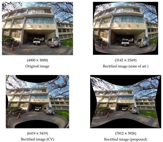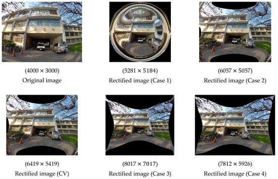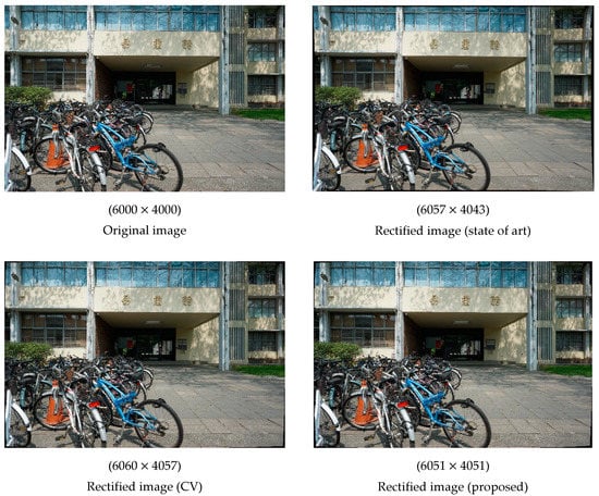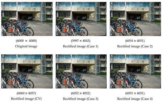 The numerical results in Table 5 do not clearly indicate which set of ICPs is optimal. Therefore, we generated rectified images using ICPs obtained from each method. The effects of rectification (with relevant image resolutions listed) are illustrated in Figure 9. The differences were most visible in the four corners of each image. The distortion correction in Case 1 was more obvious than that in the other cases; however, the five rectified images look similar to the original images because of the small amount of lens distortion. Moreover, the differences in the resolution of the images, rectified using different methods, were minimal. The difference in resolution between the original image and each rectified images was less than 60 pixels.