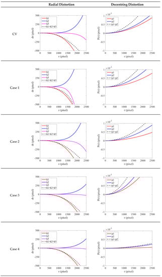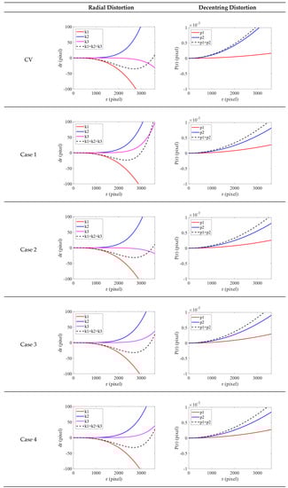 The radial distortion and decentring distortion plots generated with the CV model are displayed in Figure 10. For each radial distortion plot, the red, blue and pink solid lines indicate , and , respectively. The black dotted line indicates the overall radial distortion curve. For each decentring distortion plot, the red and blue solid lines indicate and , respectively. The black dotted line indicates the overall decentring distortion curve. The values in the x- and y-axes in each figure are in pixels. In both plots, the boundary of x-axis is 3500 pixels. The curves obtained using the CV method can be used as a reference to evaluate the fit of the curves in Cases 1 to 4.