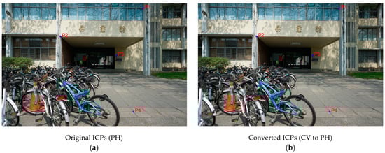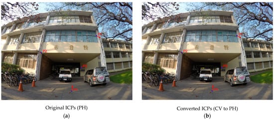 Visual results of corrections (Sony): (a) using the original ICPs (PH) (b) using the converted ICPs (CV to PH).