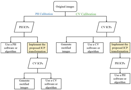Nowadays, image users for measurement, mapping or navigation frequently apply mixed software packages developed in the fields of PH and CV. For example, someone may apply a camera calibration software developed in the field of PH, then apply a CV software to recover image position and orientation. Under this circumstance, parameter transformation is needed to bridge between the software; this paper aims to clarify the camera model definitions and to propose a complete ICP transformation. By taking this approach, image users will be able to apply mixed software; an imagined example of this workflow is depicted in Figure 17. Consequently, further studies and applications could be generated in both fields accordingly. In addition, rectified images can be generated efficiently, no matter if the camera calibration is performed using a PH or CV model.