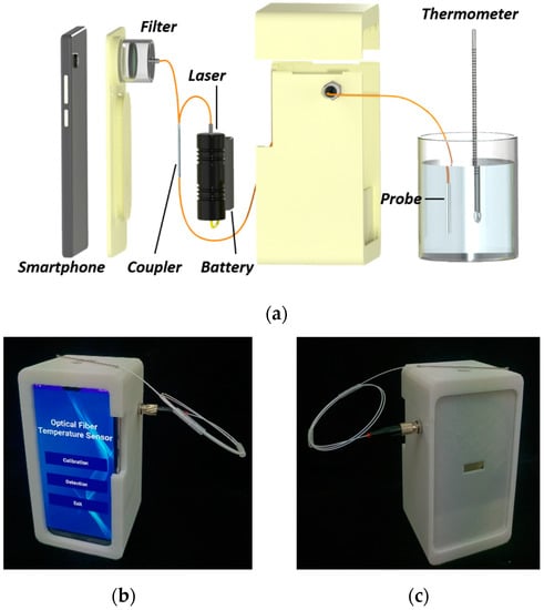 The schematic of the smartphone-based optical fiber fluorescence temperature sensor used for fluorescence signal excitation and collection is shown in Figure 2a. The reflective-mode system owning a parallel configuration makes it compact and easy for remote and on-site detection. A small 405 nm fiber-coupled semiconductor laser (Haoran Optics, China) with an output power of 3 mW driven by two AA batteries is employed as the excitation light source. A smartphone (Huawei P20 Pro, China) is adopted for fluorescence signal collection and data analysis. A 500 nm long-pass filter (FEL0500, Thorlabs, Newton, NJ, USA) is placed in front of the smartphone camera to reduce the impact of the excitation light. Both the laser and the smartphone camera are connected to the sensing probe via a 2 × 1 fiber coupler with a coupling ratio of 50/50, where the two ports are connected to the laser and smartphone camera, and the one port is connected to the sensing probe. The laser, batteries, filter, fiber coupler, and smartphone are integrated into a handheld holder made of a 3D-printed shell. Additionally, a ferrule connector (FC) fiber flange is present on the shell for simple sensing probe replacement. The sensor is rather compact, only with a size of 167 mm × 85 mm × 75 mm, as shown in Figure 2b,c. It is handheld and powered by inner batteries, indicating that it is a potential temperature measurement tool for on-site application.