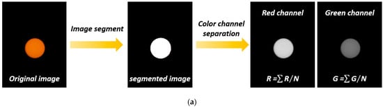 The wavelength range of the RhB fluorescence emission spectrum is from 500 nm to 600 nm, including the green channel signal (G) and red channel signal (R). A self-referenced signal ratio method of G/R is adopted to measure the temperature, which has a self-calibration ability to reduce the interference caused by environmental factors. The temperature-sensitive fluorescence signal detection and data analysis are implemented on the smartphone. Figure 3a shows the flow chart of the fluorescence signal detection algorithm. First, the image of the fluorescence signal is captured by the smartphone camera, which appears as a spot on a black background. Next, the fluorescence spot is recognized from the captured image based on the threshold segmentation. Then, the fluorescent spot image is divided into an R channel and G channel through RGB color channel separation. Finally, for each channel, the fluorescence intensity is defined as the sum of the fluorescence intensity at each pixel divided by the pixel number within the recognized fluorescence spot.
