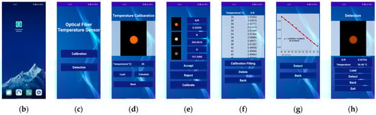 A user-friendly smartphone application is designed to automatically and quantitatively measure the temperature-sensitive fluorescence signal, as shown in Figure 3b–h. It primarily consists of two functional modules as calibration and detection. It is worth noting that the sensor should be calibrated before detection because the temperature detection is based on the calibration curve of the G/R-temperature relation. Figure 3b depicts the application icon on the smartphone desktop. Figure 3c displays the initial interface. If the calibration has been completed, selecting the “Detection” button opens the detection interface in Figure 3h; if not, clicking the “Calibration” button opens the fluorescence image loading screen in Figure 3d. Pressing the “Load” button opens the camera to take an image or selects one from the album, which then displays on the interface. After entering its corresponding temperature, clicking the “Calculate” button opens the interface in Figure 3e, which shows the fluorescence images of each channel and their calculated intensities, including R, G and G/R. Clicking the “Accept” button records the G/R value and its matching temperature in Figure 3f, and then returns to the fluorescence image loading interface in Figure 3d, while clicking the “Reject” button directly returns to the fluorescence image loading interface in Figure 3d. Clicking the “Calibrate” button in Figure 3e activates the calibration data logging interface in Figure 3f after all the temperatures have been entered and all the G/R values have been calculated. The “Delete” button can be used to remove any data, and the “Back” button can be used to go straight back to the fluorescence image loading interface. By clicking the “Calibration fitting” button in Figure 3f, a quantitative G/R-temperature calibration curve is obtained, as shown in Figure 3g, and the temperature can be measured based on it. The “Back” button in Figure 3g returns back to the calibration data logging interface, and the “Detect” button reaches the detection interface in Figure 3h to quantitatively measure the temperature. Clicking the “Load” button in Figure 3h opens the camera to take an image or load one from the album. Then, clicking the “Detect” button directly displays the corresponding G/R and temperature calculated according to the calibration relationship. The “Back” button takes you to the calibration fitting interface in Figure 3g, and the “Exit” button closes the application. It is worth noting that since the sensor application is developed based on the Android, it can be applied to any Android smartphone. Moreover, since the application contains both calibration and detection, it is convenient to apply it to other smartphones, which only need to be recalibrated and then used for detection.