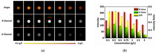 Sensing probe optimization. (a) Fluorescence images of sensing probes with different RhB concentrations; (b) R value, G value and G/R of sensing probes with different RhB concentrations.