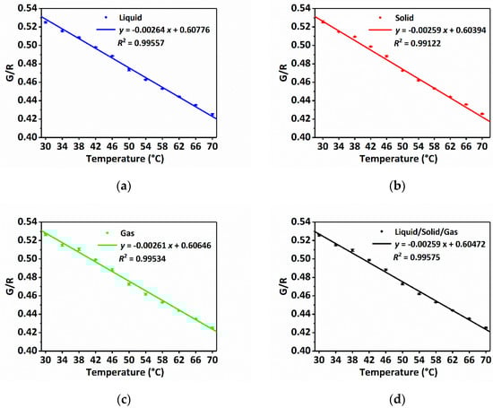 Sensor calibration. (a) Measured and fitted G/R-temperature relation in the liquid sensing condition; (b) measured and fitted G/R-temperature relation in the solid sensing condition; (c) measured and fitted G/R-temperature relation in the gas sensing condition; (d) the unified G/R-temperature relation for all environmental conditions.