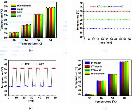 The performance of the sensor needs to be verified after completing the calibration, which mainly includes the verification of the accuracy, stability, repeatability and conservation time of the sensor. First, the accuracy of the sensor is tested via measuring temperatures under different sensing environmental conditions. The detected temperatures are within the quantitative temperature sensing range, but different from those used for calibration. Each temperature data is repeated 3 times using three sensing probes. Figure 6a shows that the measured results using the sensor are highly consistent with those obtained by thermometer, which proves that the sensor can measure the temperature in high accuracy. Next, the stability of the sensor is tested by respectively placing three sensing probes in the water bath at 40 °C, 50 °C and 60 °C. The result is recorded every 4 min. As shown in Figure 6b, the measurement result of the sensor can be stable for at least 60 min, which proves that the sensor has a good stability. Furthermore, to test the repeatability and response time of the sensor, the single sensing probe is alternately immersed in two water baths with temperatures of 40 °C and 60 °C. The time interval between two measurements is 1 s. The result in Figure 6c exhibits the good repeatability of the sensor in continuous measurements as well as the fast response time of less than 1 s. Finally, the conservation time of the sensor is tested by immersing the sensing probe conserved at 4 °C for 1, 2 and 3 months into various water baths at 30 °C, 46 °C, 54 °C and 70 °C. The result is shown in Figure 6d. It can be observed that the sensor can still work well in temperature detection after being conserved at 4 °C for 3 months. The above experiments demonstrate that the sensor has good accuracy, stability, repeatability and can be conserved at 4 °C for at least 3 months, which proves that the sensor has an excellent performance in temperature measurement. Furthermore, comparisons of the error bars of the sensor performance verification with the thermometer reveals that the calculation error is within 0.5 °C, indicating that the temperature resolution is 0.5 °C.