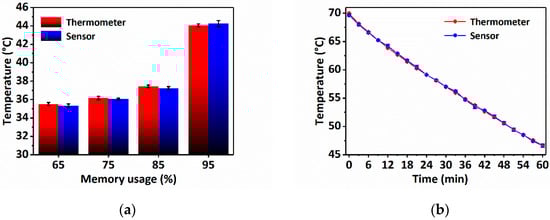 The good performance of the sensor demonstrates its potential for practical applications. Here, the temperature measurements of the computer surface and hot water-cooling process are used for practical application testing. The temperature of the computer surface can reflect the work state of the computer. For temperature detection, the sensing probe is placed on the bottom of the laptop along with a thermometer. Figure 7a describes the temperature change of the computer surface measured by the sensor with the increase in use time, which well coincides with that measured by the thermometer. For the hot water-cooling process, a sensing probe and a thermometer are directly immersed in the hot water and measure the temperature change process. Figure 7b plots both the sensor and thermometer measured temperatures, and they fit well with each other. The above results prove that the sensor can be well applied to measure temperature in practical applications.