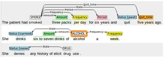 Wang et al. [75] developed an NLP system for detecting and extracting related information from substance-use sentences. The authors used the constituent parser and dependency parser along with rule-based methods to build a two-stage system. In the first stage, they detected three main subcategories of substance-use sentences (alcohol, drugs, and nicotine). In the second stage, they extracted attributes from the detected sentences, such as amount, frequency, status, method, and temporal information. They evaluated their system on two different datasets, MTSamples and notes from the University of Pittsburgh Medical Center (UPMC) de-identified clinical notes repository, achieving F1-scores of 89.8%, 84.6%, and 89.4% for alcohol-, drug-, and nicotine-use detection, respectively, as well as a maximum average F1-score of 96.6% for related attribute extraction. Yetisgen et al. [76] used a combination of machine learning and NLP approaches to identify sentences related to tobacco, alcohol, and drug use, as well as to their related attributes. Their system involved three steps: The first step detected the sentences that contained substance-use events. In the second step, they extracted seven entities to describe the events, and finally, in the third stage, they presented the extracted entities in a structured format. They evaluated their system on the MTSamples dataset, achieving F1-scores between 35.29% and 97.61%. One limitation of the aforementioned works is that they were designed for detecting sentence status rather than document status.