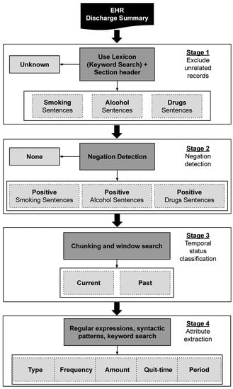 Electronic Health Records (EHRs) contain rich information about patients’ substance-use factors. This information can be either in a structured format or hidden within free text. EHRs are a source of valuable information about a vast range of diseases, health risk factors, and health outcomes [16]. This information enables researchers to conduct high-resolution interventional and observational clinical research [17,18,19]. However, most of the information is buried in unstructured narrative text [20]. Extracting information from clinical narrative text is a challenging and arduous task due to misspellings, unconventional abbreviations, and ungrammatical text [21]. In the last decade, Natural Language Processing (NLP) methods have received considerable attention as a way of analysing EHR narrative text and extracting the hidden information [16,18,22,23].