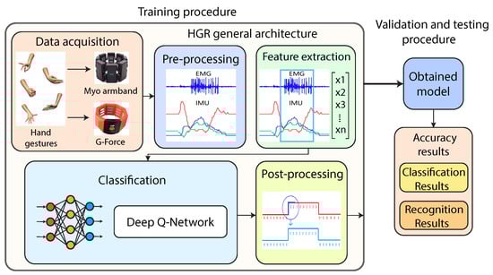 In this section, we present the proposed method for the HGR system based on EMG-IMU signals and RL (Figure 1). As can be observed, the proposed method is composed of data acquisition, pre-processing, feature extraction, classification (DQN), and postprocessing stages. The data were taken from two different armband sensors to compare results, which are the Myo armband and G-force sensors. We combined the EMG-IMU signals with the deep Q-network (DQN) reinforcement learning algorithm to develop the proposed HGR system. Next, we explain in detail each stage.