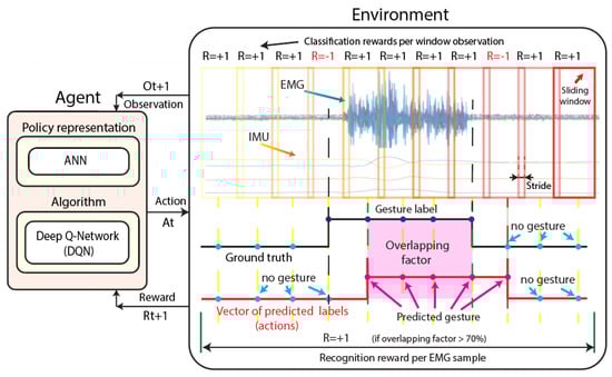 Environment: The environment is the defined environment within which the agent performs an action to move from one observation to the next, which returns a reward. In this case, we define the environment from the sliding window information—feature vectors and labels—extracted from each EMG-IMU signal and the ground truth (vector of known labels) of the EMG-IMU signal.