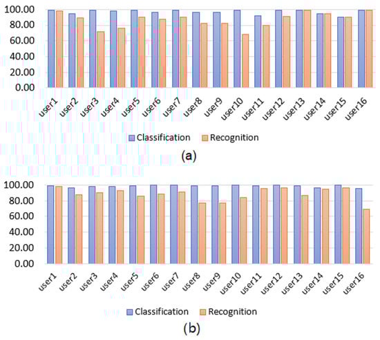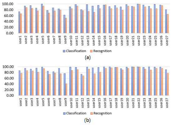 User-specific HGR model classification and recognition accuracy results for the Myo armband sensor using DQN. (a) Static gestures. (b) Dynamic gestures.
