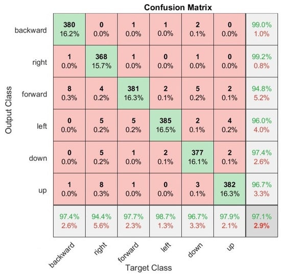 To present the testing results, we performed experiments on the test set based on the best hyperparameters previously found during the validation procedure presented in Section 3.1. This procedure helped us to evaluate our models with different data and analyze overfitting. We summarized the test results for 306 users with the best-found hyperparameters in Table 4. The classification results were similar for the two sensors, with the Myo-armband sensor obtaining slightly better results, with differences of for static gestures and for dynamic gestures compared to the G-force sensor. On the other hand, the recognition accuracy was similar for both sensors for the testing results compared with the validation results, with the exception of the G-force sensor, in which the recognition values were and for static and dynamic gestures, respectively. Overall, the testing classification results were similar to the validation results, demonstrating that the proposed models are robust to the effect of overfitting in terms of the classification of the proposed dataset distribution. Only for static gestures of the G-force sensor were the recognition results slightly lower. This is explained by the different distribution of the data and the variability of the users, as well as the fact that the hyperparameters were calibrated only for the validation dataset and not for the testing dataset.