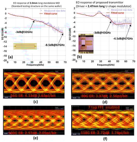 The performance of the co-packaged all-silicon transmitter is thoroughly analysed and compared with a standard 2 mm long silicon MZM, which is fabricated within the same SOI wafer. Firstly, the EO responses of both devices are tested, as shown in Figure 2a,b. As expected, the 3 dB EO bandwidths of the co-packaged silicon transmitters are considerably higher than the standalone devices. Highlighting the EO response at 67 GHz for comparison, the co-packaged devices are at −4.5 dB, whereas the standalone devices are at −8.2 dB. This means that co-design of the electronics and photonics devices could significantly alleviate the bandwidth limitation concerns of silicon modulators. Furthermore, when operating at the quadrature point, optical eye diagrams at 56 GBaud OOK, 80 GBaud OOK and 100 GBaud OOK, shown in Figure 2c–e, were detected, where no equalisation techniques were used. When a 7 tap feed-forward equalisation was adopted within the DCA, the co-packaged all-silicon transmitter could operate up to 118 G OOK while the CMOS driver only consumed 205 mW shown in Figure 2f.