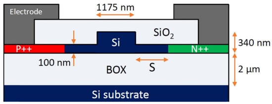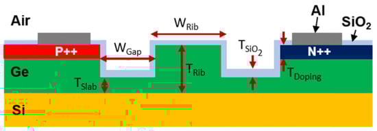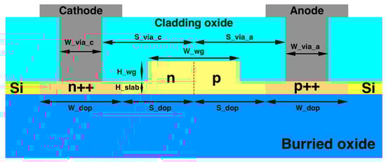 Currently the longest wavelength modulators fabricated on SOI substrate were shown operating at the edge of the SiO transparency range—3.8 m [82]. PIN diodes were used as phase shifters to inject carriers in an MZI by using the free-carrier electrorefraction effect and in a variable optical attenuator (VOA) by using free-carrier electroabsorption effect. The cross section of the diode used in both configurations is shown in Figure 7.