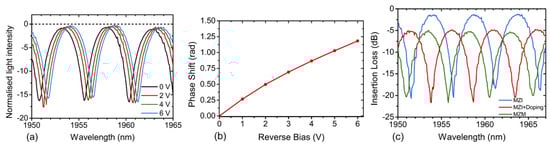 (a) Normalisedlight intensity spectra from the MZM at 0–6 V reverse bias voltages. (b) Phase shift for a MZI modulator with 2 mm long phase shifter. (c) Insertion loss of the 2 mm MZM device and its two reference structures (MZM without metal electrode; MZI without metal nor doping) [75].