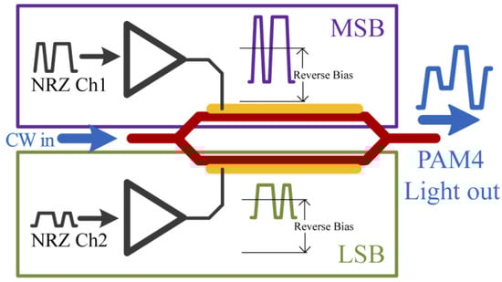 Recently the PAM-4 modulation format has become more popular as it has been chosen for the latest active IEEE Ethernet standard. This is a variation of the pulse-amplitude modulation format in which 4 levels represent data. Generating PAM-4 signals in the electrical domain is typically achieved by combining two non-return to zero (NRZ) signals with a digital-to-analogue converter (DAC). With increasing bandwidth this becomes difficult to design and is not cost effective, requiring highly linear drive amplifiers [81]. A viable alternative is to use MZM devices to generate PAM-4 signals in the optical domain. One such demonstrated solution is the use of a streamlined intensity-modulation, direct detection (IMDD) PAM-4 generation scheme.