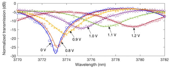 The simplest method for achieving phase modulation in Si is to exploit the thermo-optic (TO) effect. A resistive heater is positioned close to a waveguide (but in the case of a metal heater, far enough away so that it does not introduce excess optical absorption), so that when a current is passed through it the waveguide is heated locally, and thus the waveguide’s effective refractive index () is changed. The accompanying change in absorption coefficient () is negligible. In the mid-IR, the TO coefficient of Si (which relates the material’s temperature to its refractive index) reduces slightly compared to its value in the near-IR [69], but nevertheless remains strong. An SOI TO modulator was demonstrated at 3.8 m in [70]. A TO phase shifter was placed in one arm of a Mach–Zehnder Interferometer (MZI), and was demonstrated to modulate light with an efficiency of 47 mW/. It should be noted that, because in a phase shifter the change in phase is inversely proportional to wavelength, for an equivalent the waveguide must be proportionally longer to achieve the same phase change, so the power consumption of a TO phase shifter would also increase proportionally. Furthermore, because the mode size also increases as wavelength is increased, metal heaters must be placed further away, reducing the overlap of any generated temperature increase and the optical mode, and further reducing the phase shifter efficiency. TO phase shifters operating at mid-IR wavelengths are thus intrinsically less power efficient than their direct near-IR equivalents (e.g., [71]). The key limitation of TO modulators is that their bandwidths are limited by slow thermal diffusion to the 10 s of kHz range, which is sufficient for some sensing and switching applications, but not for telecommunications.