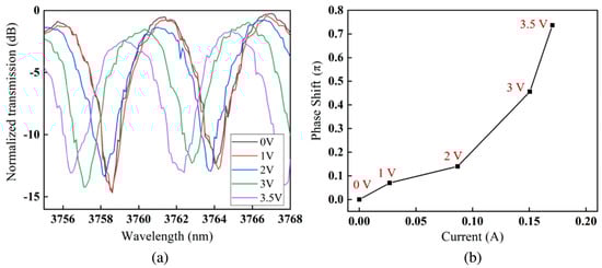 (a) Optical spectra of the GOS MZM under several DC voltages. (b) Phase shift versus current of the MZM from [10].