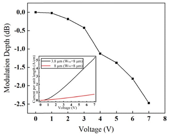 Modulation depth versus applied voltage for a GOS EAM operating at a wavelength of 8 m. Inset: current per unit length versus voltage at wavelengths of 8 m and 3.8 m from [10].