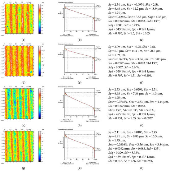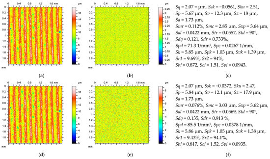 Various surface types were studies after the turning process. In Figure 1, two examples of turned surfaces topographies and their parameters are presented: amplitude (root-mean-square height Sq, skewness Ssk, kurtosis Sku, maximum peak height Sp, maximum valley depth Sv, the maximum height of surface Sz, arithmetic mean height Sa), functional (areal material ratio Smr, inverse areal material ratio Smc, extreme peak height Sxp), spatial (auto-correlation length Sal, texture parameter Str, texture direction Std), hybrid (root-mean-square gradient Sdq, developed interfacial areal ratio Sdr), feature (peak density Spd, arithmetic mean peak curvature Spc), functional indices (surface bearing index Sbi, core fluid retention index Sci, valley fluid retention index Svi), and ISO 25178 from the SK family (core roughness depth Sk, reduced summit height Spk, reduced valley depth Svk, upper bearing area Sr1, lower bearing area Sr2). The surface in the first row (Figure 1a,b) is raw measured data, and the surface from the third row (Figure 1e,f) was obtained after areal form removal by application of a polynomial of the 8th degree [54].