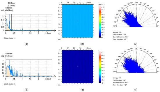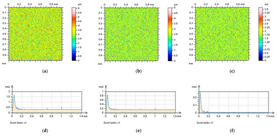 Some improvement in the observation received can also be found when analysing PSD. Even though each of the three cut-off values (Figure 10d–f) represent proper PSD justifications, PSD from the NS obtained while 0.015 mm FFTF bandwidth was applied confirmed the selection of an appropriate cut-off value (Figure 10f). It can also be observed that the smallest value provided the most high-frequency components on the NS.