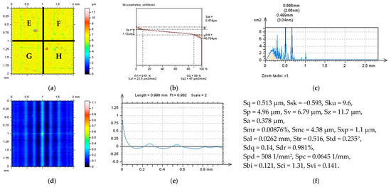 The presentation and discussion of the results obtained are divided into two crucial sections. Firstly, in Section 3.1, regular, available commercial software methods are compared with the application of a feature-based technique. Secondly, in Section 3.2, improvement in the selection of a digital filtering cut-off value is presented with the application of feature-based characterisation. In Figure 5, the process of dividing the measured turned surface into four separate (E, F, G, and H) surfaces is presented. Each of them contains different features with various densities, analysed further in Section 3.1. and 3.2.