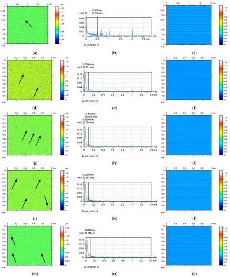 In Figure 6, NSs defined by an RGF (cut-off = 0.015 mm) for the whole measured surface (a) and each of the extracted surfaces are presented: E(d), F(g), G(j), and H(m). For each of the studied surfaces, the NSs contain features that cannot be defined (in a non-high-frequency domain). Even the PSDs (middle column) of the NSs indicated the presence of high-frequency domains (Figure 7), the occurrence of some unacceptable features (it was indicated by the arrows), such as dimples and scratches for measured surfaces (a), holes for surface E (d), and scratches for surfaces F (g), G (j), and H (m), makes analysed method inappropriate. When another method (filter) was used (e.g., FFTF), additional features were also defined on the NSs (Figure 8). However, from all of the methods applied (GF, RGF, SF, and FFTF), the most encouraging results when studying the isometric view of the NSs were received when an FFTF was used. This method can be classified as the most suitable for the detection of high-frequency measurement errors and has been proposed in previous studies [36].