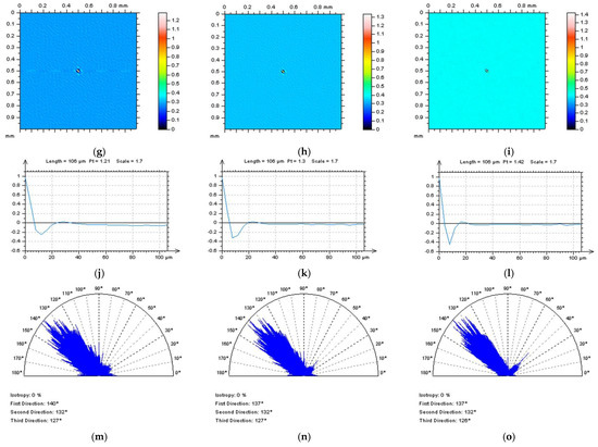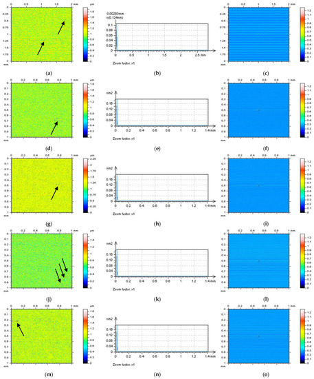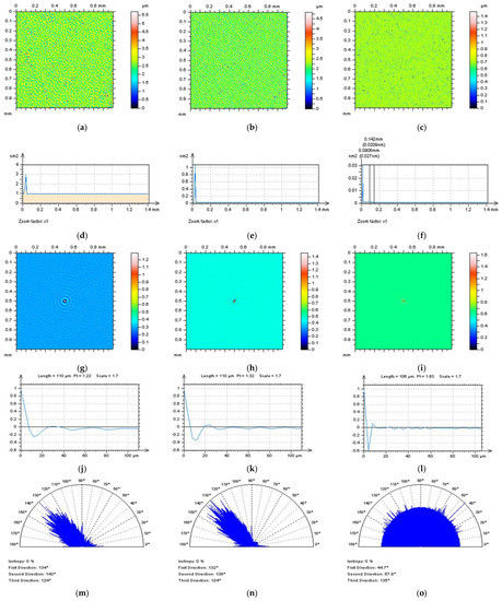 The white light interferometer Talysurf CCI Lite (produced by Taylor Hobson Ltd., Leicester, UK, version 2.8.2.95), a non-contact measurement device, was also employed with a height resolution of 0.01 nm, a measured area of 3.35 by 3.35 mm with 1024 × 1024 measured points, and spacing of 3.27 μm. A Nikon 5×/0.13 TI objective was used for all the optical measurements. The effect of sampling on areal texture parameters was not studied in this paper.