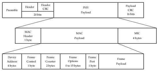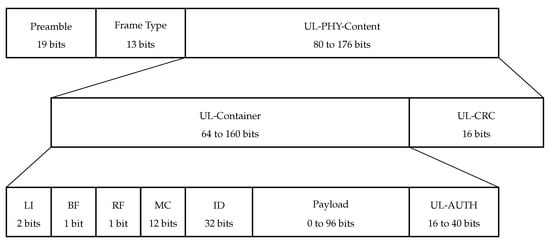 The uplink frame structure is shown in Figure 6. It begins with a preamble, which allows the receiver device to synchronize and defines the frame modulation scheme since it is modulated with the same spreading factor as the rest of the frame. Typically, the preamble duration is 12.25 , where is the symbol duration.