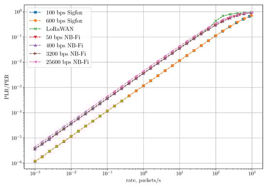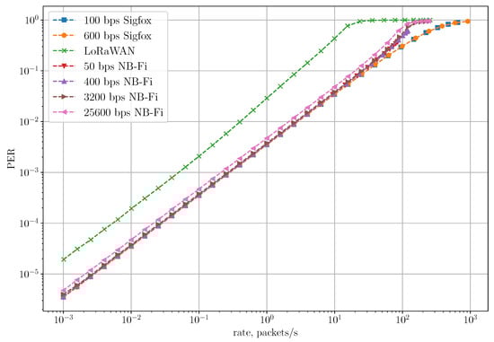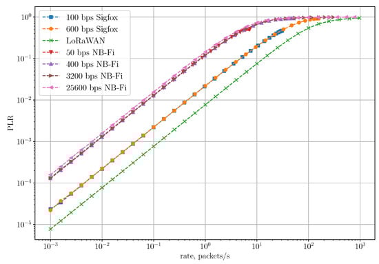 Note that the curves in Figure 14 and Figure 15 stop at some maximal rate. NB-Fi networks, where sensors operate using bitrates of 50 and 400 bps, demonstrate the lowest maximal rates. Specifically, the rate does not achieve higher values than approximately 80 packets/s for 50 bps and 120 packets/s for 400 bps because at such rates the devices operate in saturation: they generate new frames after a delay that is much lower than the total duration of data frames, receive windows, and the window from which the random delay is drawn. At the same time, NB-Fi networks that use bitrates of 3200 and 25,600 bps can generate more packets and thus achieve higher rates. In addition, at high rates, NB-Fi networks that use 3200 or 25,600 bps bitrates demonstrate higher PLR than Sigfox networks because of the high probability of overlap in frequency and a relatively small ratio of the receive and retry durations to the frame duration.