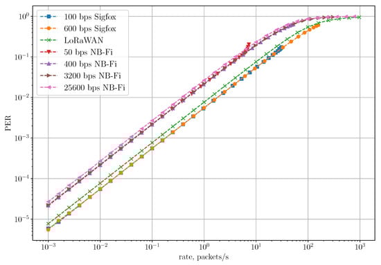 Figure 15 shows the dependence of PER on the rate for the Reliable Transmission of Short Packets Scenario. PER in the LoRaWAN network is the highest compared to other considered networks for the same reason as PLR is the highest one. Sigfox and NB-Fi networks demonstrate similar PER at lower rates because of the similar channel access procedure and the same modulation in these technologies. At lower rates, PER is primarily determined by the probability of success during the first transmission attempt, which depends on the probability of frames overlapping both in time and frequency. Since in the considered scenario all sensors in Sigfox and NB-Fi networks use one bitrate, this probability does not depend on the chosen bitrate and, in our case, on the technology because frame duration is inversely proportional to the occupied frequency band. However, at higher rates, NB-Fi provides higher PER than Sigfox because of the frequency selection algorithm used in NB-Fi for downlink transmission. As was explained in Section 3.3, for downlink transmissions, the server calculates the central frequency as a function of bitrate and Modem_ID, which means a higher probability that the server chooses the same central frequencies for multiple sensors at higher rates. Thus, ACK transmission is delayed and if this delay exceeds the timeout duration ( in Table 3) the ACK is not transmitted. On the other hand, in Sigfox networks, frames are not acknowledged, therefore resulting in lower PER at higher rates.