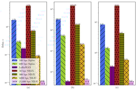 Moreover, such randomization has a significant effect on the average delay. Figure 13 shows the average delay for different scenarios. The average delay for the Unreliable Transmission of Long Packets Scenario with the randomization is significantly higher than for the same scenario without the randomization. For example, NB-Fi operating at 50 bps demonstrates an average delay of almost 1500 s because the time interval between each frame is uniformly distributed within the window of s, meaning a 43 times increase compared to the same scenario without randomization and 256 times increase compared with the unreliable transmission of short frames scenario. On the other hand, even with the randomization, NB-Fi at 25,600 bps demonstrates an average delay comparable with LoRaWAN networks due to a much lower frame duration. However, given that initial research showed that such randomization does not affect the PLR significantly, but notably lowers the maximal rate and increases the average delay, such randomization is unnecessary. Therefore, to consider a wider range of rates and to lower the average delay, we consider for the next scenario that , where ms is the lowest gap duration between frames in a multiple frames U-procedure or different procedures, allowed by the Sigfox standard [21].