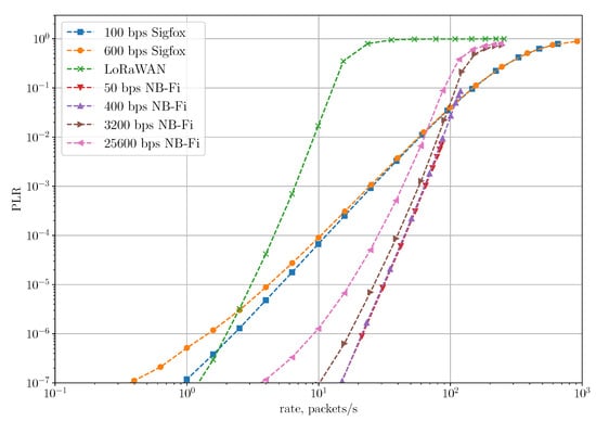 Note that Figure 11 shows PLR values up to some maximal rate that depends on the technology and the bitrate. For example, the 100 bps Sigfox curve stops at approximately 40 packets/s. With the considered traffic model, when sensors generate new frames only after transmission of the previous ones, at some rate, the network reaches saturation and cannot achieve higher rates: devices generate new frames at the time which is negligible compared with frame durations and inter-frame intervals. NB-Fi networks operating using 50 and 400 bps and Sigfox networks demonstrate the lowest maximal rates because the total duration of block transmission is much longer than the frame duration. Such a high ratio is the result of randomizing time interval between transmissions within a large interval because in this scenario, ms, and , where is the frame duration.