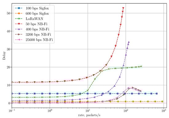 Figure 16 shows the average delay for the Reliable Transmission of Short Packets Scenario. Since Sigfox networks operate without acknowledgments, the average delay is constant for any rate and equals . In NB-Fi and LoRaWAN networks, at lower rates, the average delay is primarily determined by the round-trip time, which is inversely proportional to the bitrate. When the rate increases, so does the number of retries required for the successful frame transmission, which significantly increases the average delay. In LoRaWAN networks, the average delay starts increasing more rapidly and at lower rates than in NB-Fi networks because of the collision avalanche caused by an inefficient collision resolution approach [37]. However, the increase rate significantly lowers at approximately 200 packets/s, which correlates with PLR reaching a plateau at the same rates. In NB-Fi networks operating at 3200 and 25,600 bps, the average delay decreases after reaching the maximal value because, at such a rate, the PLR is high and frames are either lost and do not affect the average delay or are transmitted successfully without many retries.