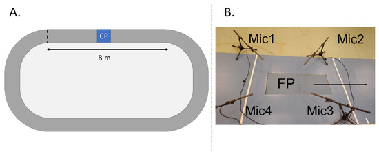 All participants were asked to perform overground running at their preferred running speed. Prior to testing, the runners had a 5-min warm-up consisting of walking lunges, skipping, leg swings and run-throughs [14], followed by a 5–10 min familiarization to the running track. During the warm-up, their preferred running speed was established. The running track was a 20-m indoor-obround running track (2-m running turns and 8-m sprinting lines) with a force platform and four surrounding microphones located in the middle of the first sprinting line (Figure 1) [18]. The microphones’ location did not interfere with the runners’ sprinting line trajectory.